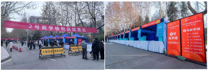 校园内悬挂的考研祝福横幅,均源自师生原创征集,从百条投稿中精选而出,字里行间传递着西大温情,为考生加油鼓劲。考场严格按省级规范布置,标识清晰醒目、隔离措施到位,营造公平公正的考试环境。